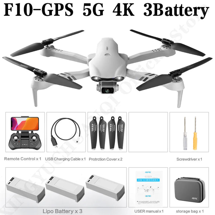 This advanced 4DRC model, the 4d-f10, has a remote distance of 1000M and comes with all the necessary accessories for an enhanced flying experience. You'll receive the original box, batteries, operating instructions, charger, remote controller, camera, USB cable, and a control battery. With an impressive anti-wind ability of 10km/h, this drone is perfect for capturing stunning 1080p FHD and 4K UHD videos. With a takeoff weight of only 165g, this metal drone is perfect for aerial photography. Get ready to explore with the 4K HD Dual Camera Drone with GPS 5G WIFI Wide Angle FPV & Real-Time Transmission.
